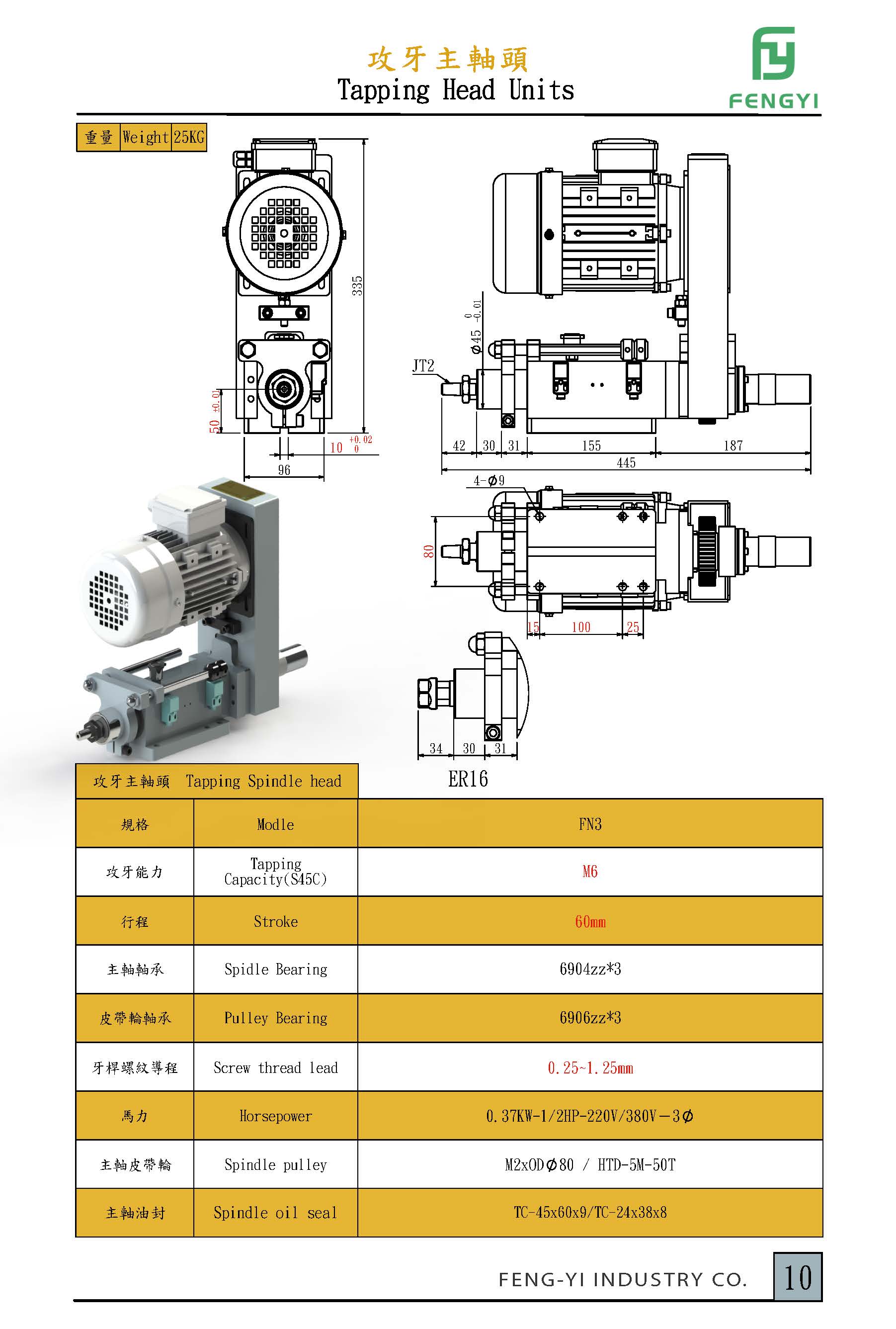 FN3攻牙动力头使用牙规传动和控制牙距行程,加工螺纹导程由0.25至1.25mm,最大攻牙能力为 M6 ( S45C ),最大行程60mm,并可搭配多轴器加工使用,提高加工效率。