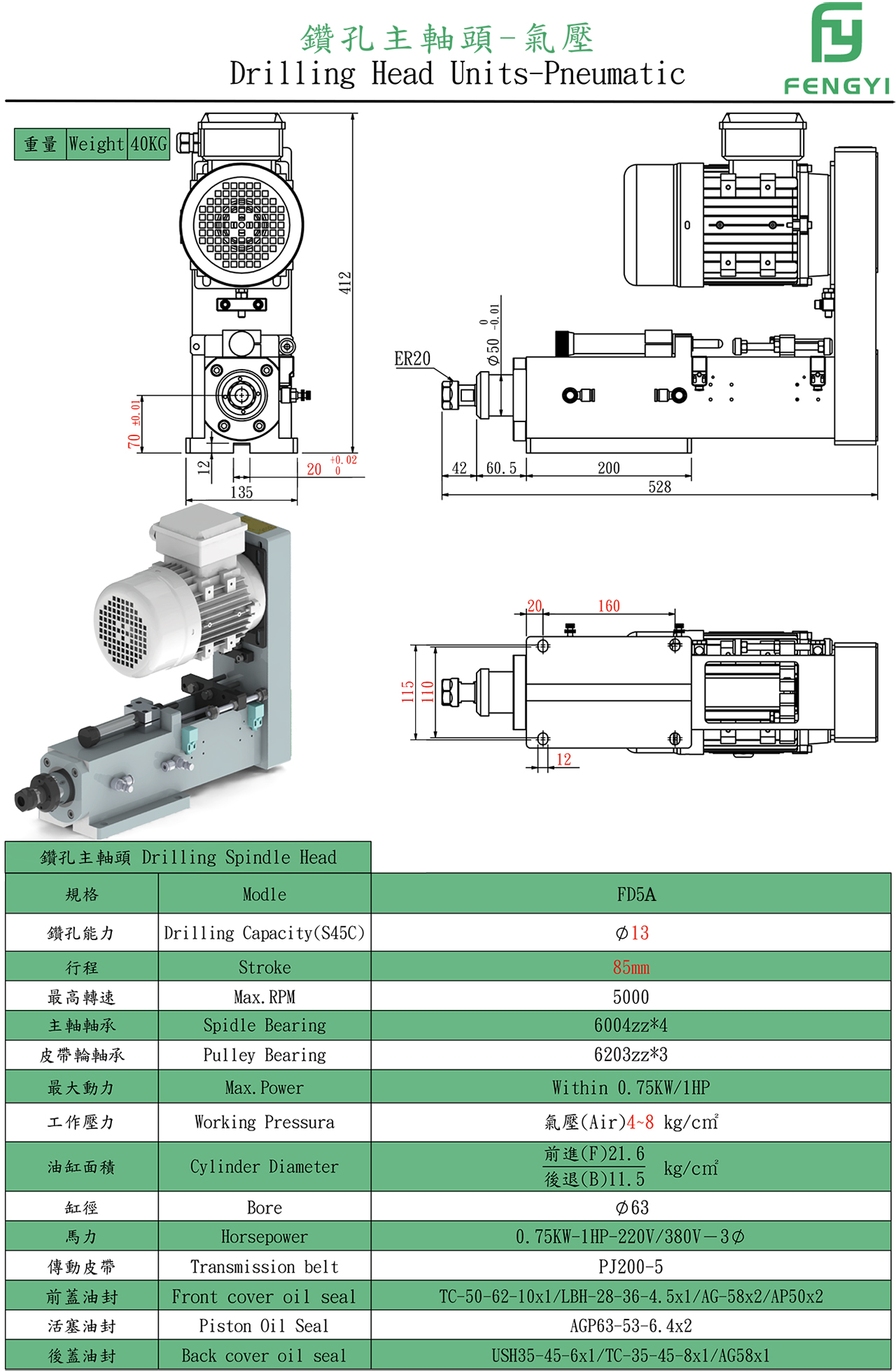 FD5A pneumatic drilling spindle head is suitable for various processing applications, including drilling, chamfering, reaming, countersinking, the maximum processing capacity is 13 mm (S45C), the maximum stroke is 85mm, the spindle nose accuracy is within 0.005,