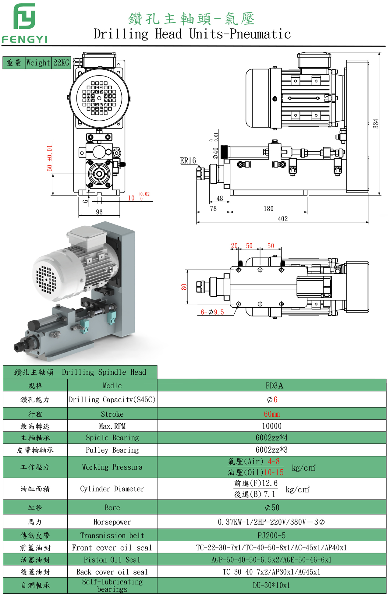 FD3A pneumatic drilling spindle head is suitable for various processing applications, including drilling, chamfering, reaming, and countersinking. The maximum processing capacity is 6 mm (S45C), the maximum stroke is 60 mm, and the accuracy of the spindle nose is within 0.005. It uses pneumatic feed to control the drilling feed speed, and can be used with multi-axis processing to improve processing efficiency.