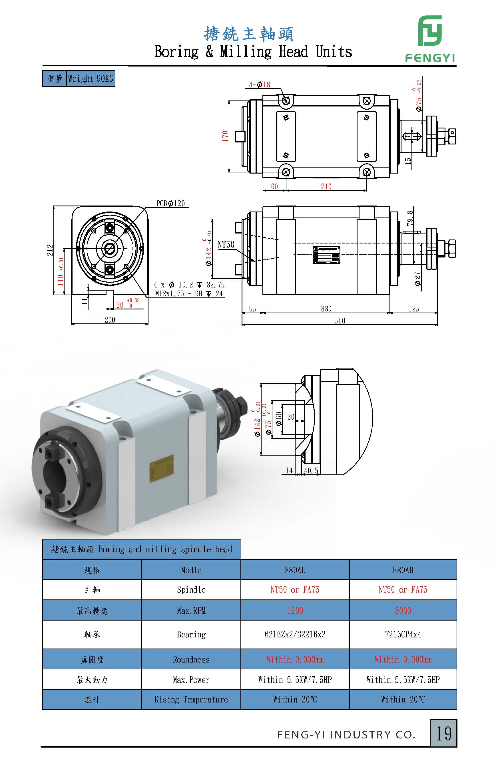 F80A spindle is suitable for various boring and milling processes, using Japanese NSK bearings, the precision of the spindle nose is within 0.005, and the maximum speed is 3000.