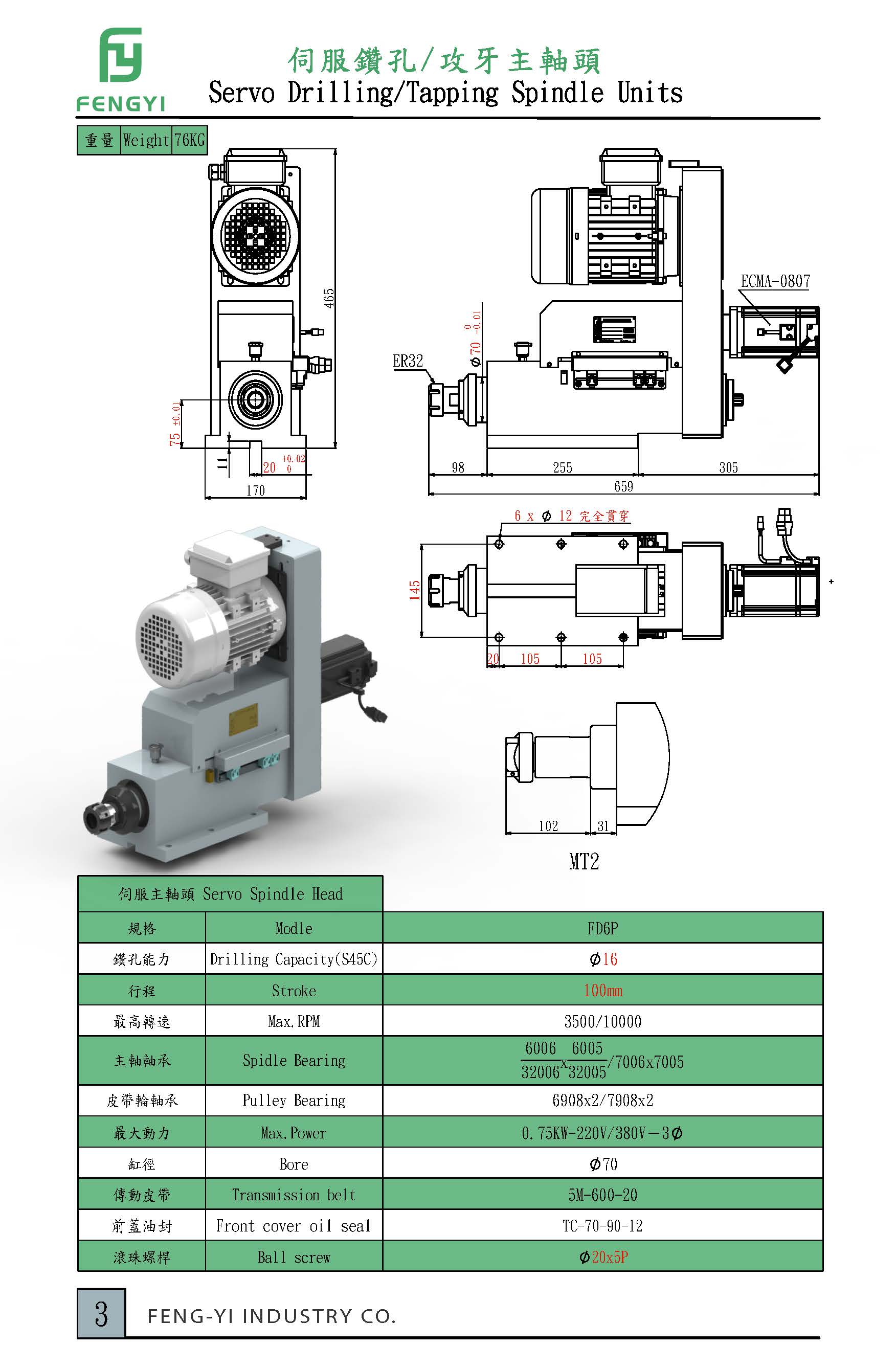 FD6P鑽孔攻牙動力頭適用於各種加工應用,包括鑽孔、倒角、鉸孔、沉孔,最大加工能力 20 mm (S45C),主軸鼻端精度0.005以內,使用伺服電機傳動控制鑽孔攻牙進刀速度及深度。