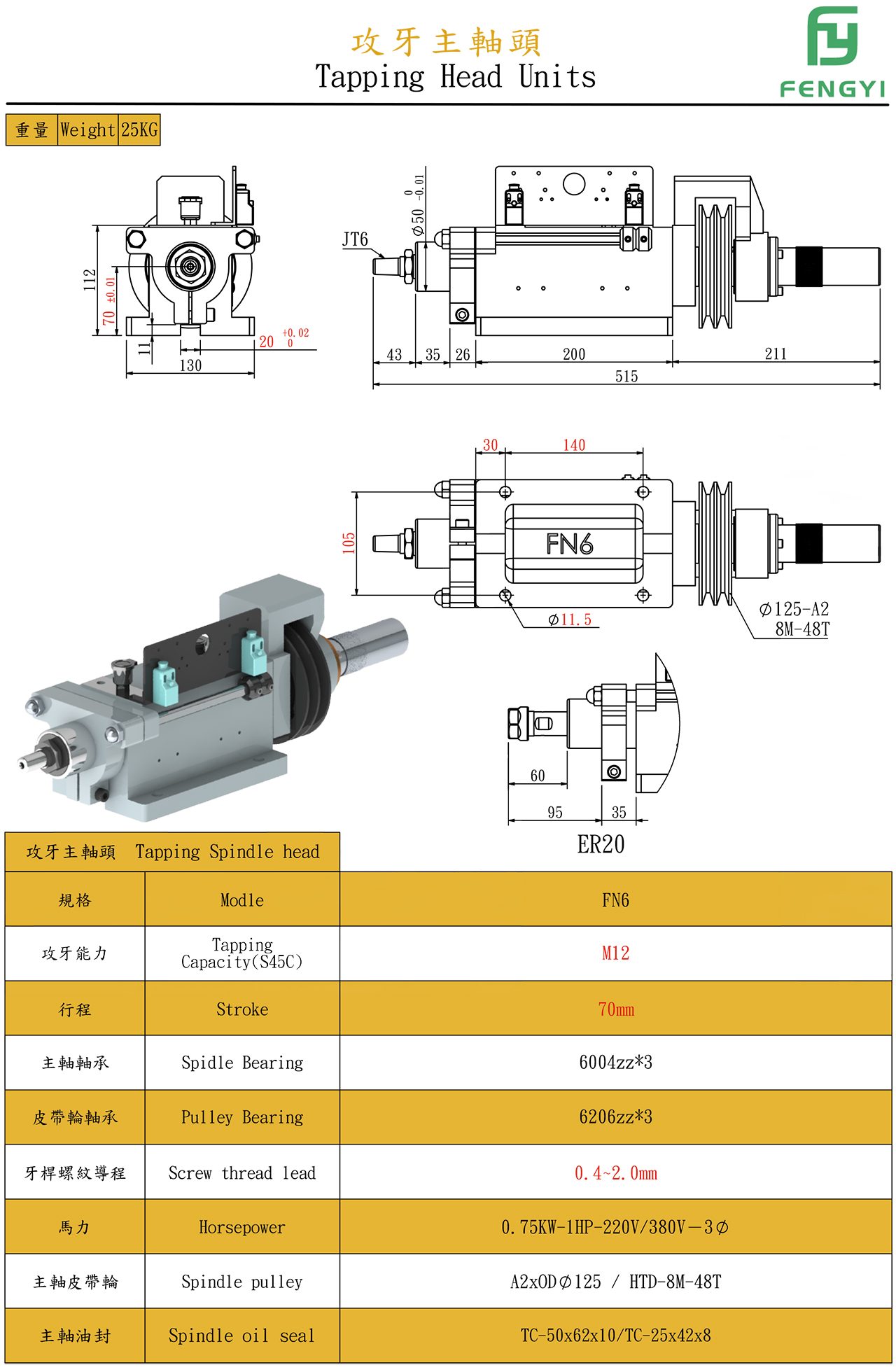 FN6攻牙動力頭使用牙規傳動和控制牙距行程,加工螺紋導程由0.4至2.0mm,最大攻牙能力為 M12 ( S45C ),最大行程70mm,並可搭配多軸器加工使用,提高加工效率。