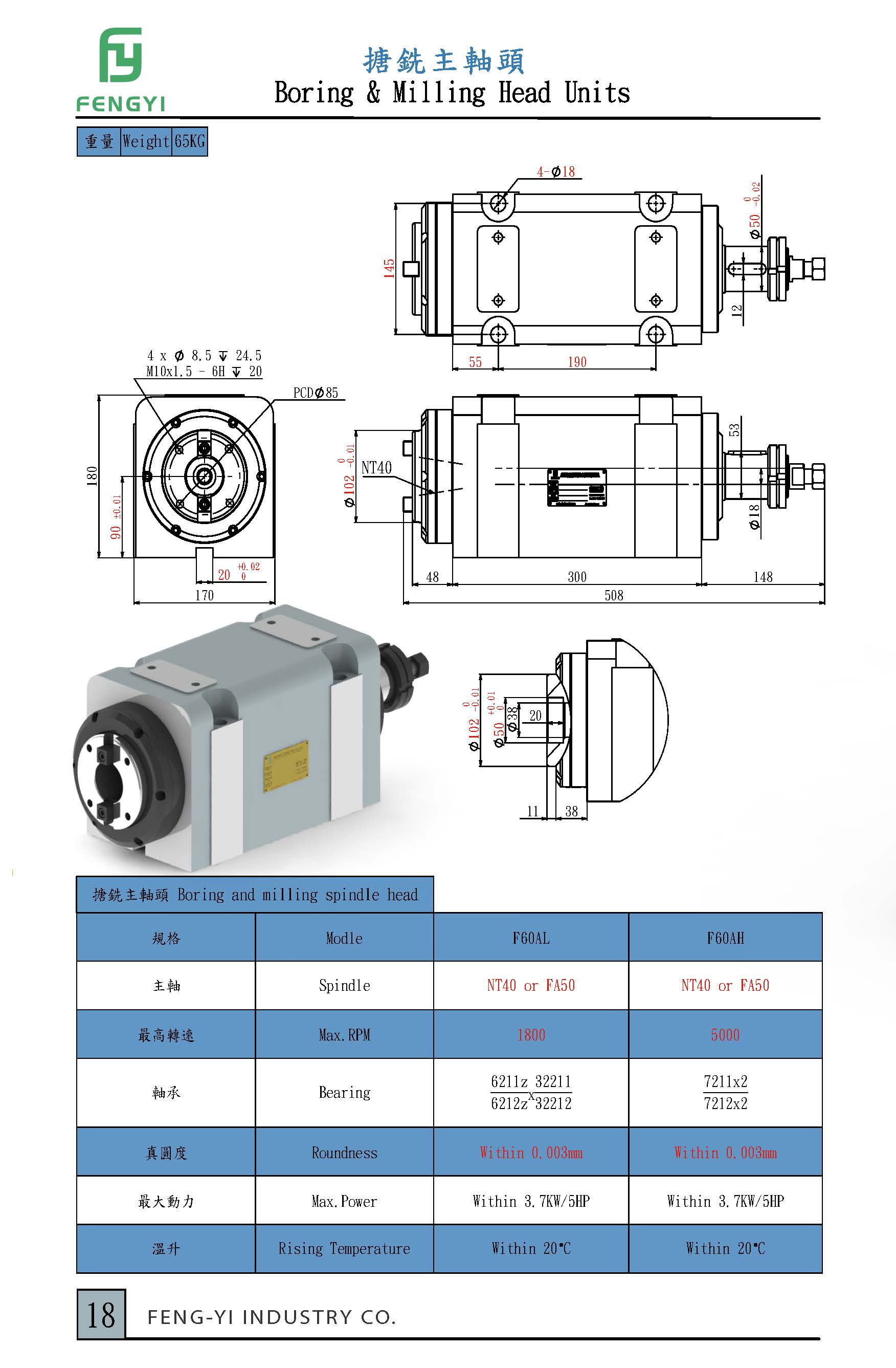 F60A主軸適用於各種搪銑加工,使用日本NSK軸承,主軸鼻端精度0.005內,最高轉速5000。